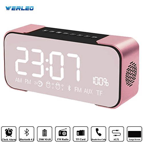 -. Feature : BLUETOOTH 4.1 SPEAKER + Large LED Display + ALARM CLOCK + MP3 Player Speaker + Make-up Mirror: 5 in one, super easy connecting / pairing with Bluetooth 4.1, compatible with all Bluetooth-enabled devices. 3 Level brightness adjustable warm LED light with Smooth Mirror Design Cover Design. Also,you can close the led if needed.Big digit 12/24H Alarm Clock with Calendar, Alarm and Sleep mode. Can be use as MP3 Player with TF Card input. / High Quality Crstal Clear Sound distinct mids and highs from our two precision acoustic drivers delivers excellent stereo sound and enhanced bass from our proP.R.Ietary passive bass radiator design;LOUDER VOLUME SPEAKER - free at maximum volume; room filling surround sound, perfect bluetooth speakers for home, dorm room, office desk,kitchen, bathroom, car, parties / Multiple Functions Speakers: Multiple interfaces allow the music to be played through Bluetooth or TF card.The built-in aux connector makes it easy to plug-and-play from any device.High capacity Bluetooth Speaker with usb port,rechargeable 2500mah battery for up to 8-10 hours of playtime.Powerful 2 x 5W Built-in Large-capacity rechargeable Li-Ion Battery / Wide Compatibility: Works well with all Bluetooth devices including: iPhone, iPad,iPod,Samsung, Kindle,Smartphones, Tablets; play audio from laptops, PC, and non-Bluetooth devices using with 3.5mm audio cable/AUX-IN jack / Package Contents: Werleo Aluminium Wireless Bluetooth Speaker with color box,1 x USB charging cable, 3.5mm audio cable, user manual and 1-year warranty with free lifetime technical support.