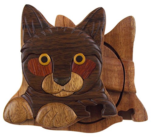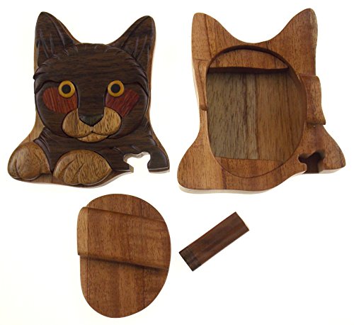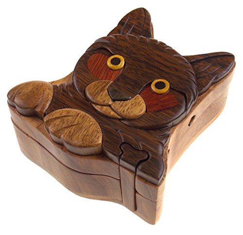 Studio : Hickoryville Publisher : Hickoryville Binding : Kitchen Product Description Handmade carved Cat intarsia puzzle wooden box bundled with Hickoryville instructions on opening and closing the puzzle box. This secret puzzle box is a beautifully handcrafted creation, high quality workmanship, made of natural wood. The box is a puzzle that comes apart into four pieces and discovers a secret space to keep special treasures. Inside storage space is approximately 2.2 inches long x 2.3 inches wide. Every box is a unique, handcrafted creation and yours may vary slightly from the photos. 0