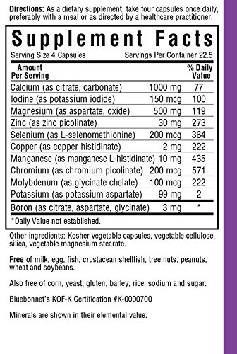 Bluebonnet's Multi Minerals Plus Boron is a high potency multimineral supplement formulated with advanced chelating agentsm including: aspartates, citrates, picolinatesm and histisdinates. Iron free for individuals concerned with iron consumption. Available in easy-to-swallow capluses for maximum assimilation and absorption.Feature