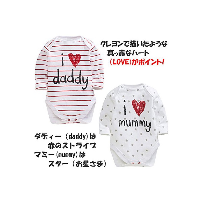 아이라《부다디》(파파)&《마미》(마마)의 로고 들어감 롬퍼스(rompers)(커버 올).다 D(daddy)서는 빨강의 스트라이프,《마미》(mummy)서는 스타(별씨)의 디자인.크레용에 그렸던 바와 같은 새빨간 하트(LOVE)가 포인트입니다.