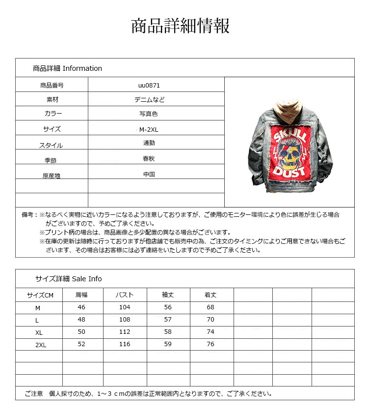 ■素材:デニムなど■カラー:写真色■サイズ:M着丈68バスト104袖丈56肩幅46L着丈70バスト108袖丈57肩幅48XL着丈74バスト112袖丈58肩幅502XL着丈76バスト116袖丈59肩幅52■原産地:中国