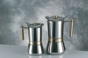 -. Feature : 12 to14 espresso cup capacity / 18 10 heavy gauge Stainless Steel construction / Stainless steel filter basket and brass pressure release valve / Polished brass handle and lid knob / please note: capacity is for european espresso cups