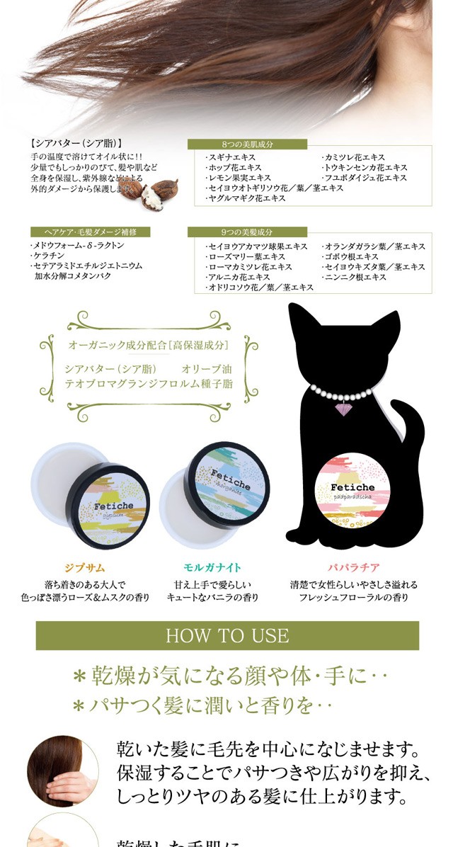 適量を手に取り、髪・顔・手などの気になる部分にお使いください。 |