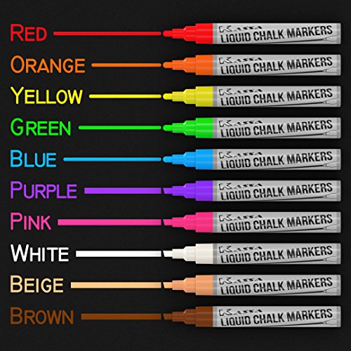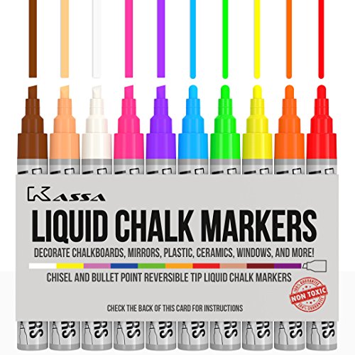 The Kassa Liquid Chalk Markers are the ideal tool for drawing or writing on chalkboards (best with the Kassa Chalkboard Decal, also sold on Amazon), glass, windows, and almost any imaginable surface. These chalk pens are child friendly (water based, non-toxic), great as bistro chalk markers, and will simply brighten up your life for any project that you desire. The chalkboard markers are wet wipe and easily erasable (for non-porous surfaces).