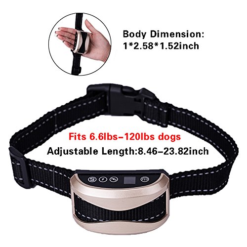 Specifications: Item Size: 2.6 X 1.5 X 1.3 Inches The no bark collar diameter range: 1.2~7 inches Weight: 2.4 ounces Battery Capacity: 280mAh Suitable for different size dogs (7lbs to 120lbs)