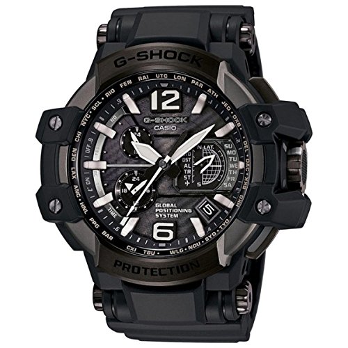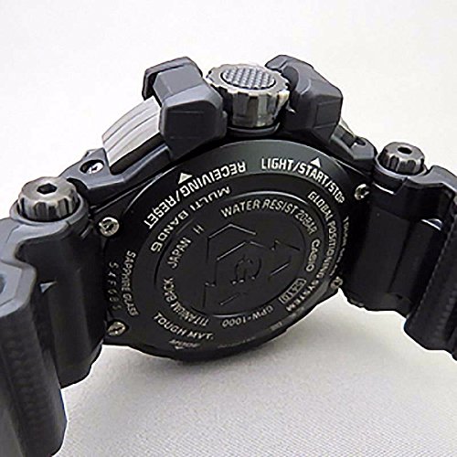 Maintaining its bold, dignified look this Casio G-Shock Gravitymaster watch features a GPS hybrid radio-controlled solar-powered system that keeps accurate time by utilizing location based GPS signals and one of six time calibration signals around the globe. A new lightweight and highly durable 64 titanium bezel keeps the watch from average wear and tear degeneration. The city code ring, back cover, band ring, and buckle also feature ion plated titanium. The dramatic, basic black of the Casio watch is accented by large white easy-to-read hour markers and white hour, minute and second hands.