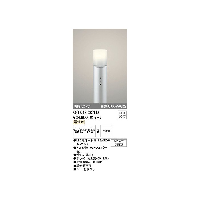 원본상품명: ODELIC(オ?デリック) エクステリアライト LEDガ?デンライト【明暗センサ】 マットシルバ?:OG043387LD