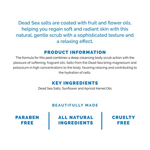 ABOUT THIS PRODUCT SCARLETT PARIS® Body Peeling with Dead Sea Salts are coated with fruit and flower oils, helping you regain soft and radiant skin with this natural, gentle scrub with a sophisticated texture and a relaxing effect. The formula for this peel combines a deep-cleansing body scrub action with the pleasure of softening, fragrant oils. Salts from the Dead Sea bring magnesium and potassium in high concentrations to the body, favoring relaxing and contributing to the hydration of cells.