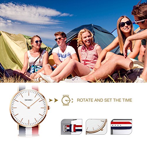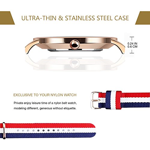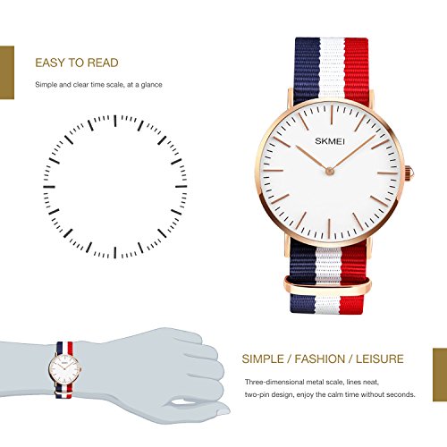 -. Feature : SIMPLE CLASSIC CASUAL DESIGN: affordable casual design, Canvas band, Round big dial dress watch with gold-tone stainless steel case featuring white dial, simplicity of business casual, bring you the back to the classic. Also make it a great gift for family or friends. / FRANCE FLAG COLOR: Vive la France! This watch celebrates France with the distinctive and stirring colors of the French tricolour flag, perfect for any sports fan or athlete. / NYLON Band: Tricolored canvas band with center stripe and buckle closure, Striped white, red and blue nylon strap. Exceptionally strong, abrasion resistant, low in moisture absorbency & easy to wash. / DURABLE & SUPER THIN: Original quartz movement with analog display, provide precise and accurate time keeping. Stainless steel water proof case cover, 6mm thin design, super thin and light. / WATERPROOF FOR DAILY USE:98 ft waterproof (30 M) - 3ATM. Perfect for all kind of business, casual, indoor activities or daily use. NOTE:In general, withstands splashes or brief immersion in water, but not suitable for swimming.
