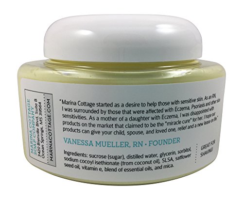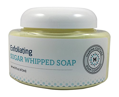 Marina Cottage Soap Co. Organic Exfoliating Sugar Whipped Soap, Lemongrass Bliss 8 Oz. Great for the entire body and even your face! Made with skin loving moisturizers and cleansers derived from natural ingredients, in a variety of unique, expertly blended fragrances! You will love the light fluffy texture of this exfoliating sugar whipped soap and the seemingly endless bubbly lather with just enough fine sugar to gently exfoliate, polish and soften the skin. You'll get TONS of bubbly lather when you use it with a bath poof! Great for shaving as well! Marina Cottage Soap CompanyTM was started in December 2012 in Ocean Springs, Mississippi by a Registered Nurse to create skin care products to help her daughter who suffered from eczema. The products are primarily made using goat's milk which is the same PH as our skin, and safe for those with skin sensitivities. Our products are also free of parabens, alcohol, mineral oil, gluten free, free of dyes and perfumes. The products are scented using blends of essential oils and we use natural minerals and oxides (mica) to color our products. We make all products in small batches to ensure quality. Did you know that 60% of whatever comes in contact with your skin is assimilated into your system? Goat milk has always been most acceptable for people with sensitive digestive tracts; this is also true of external use. Goat milk is a natural moisturizer that is high in proteins, minerals and vitamins that are easily absorbed into the skin. Goat's milk is the same PH as us whereby the molecule is absorbed into the skin easier. Gentle on your skin, leaving you with silky smooth hydrated skin.Feature