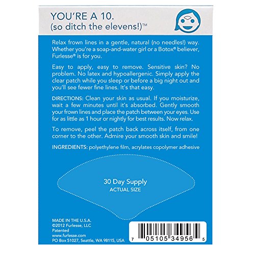 Furlesse elevens target the vertical furrows on the brow. The patches work by smoothing out the skin while holding it in place, preventing unwanted pillow creases and furrowing of the face. Can be used as a complement to your existing cosmetic injectable routine or can stand on their own as a natural, non-invasive option to relaxing facial lines and wrinkles.Feature