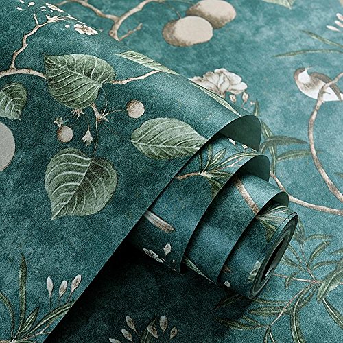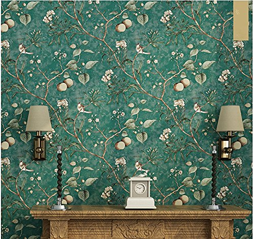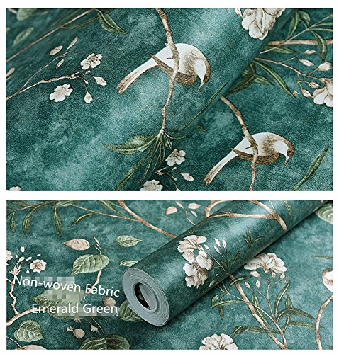 Blooming Wall Vintage Flower Trees Birds Wallpaper for Livingroom Bedroom Kitchen,57 Square Ft.,Emerald Green