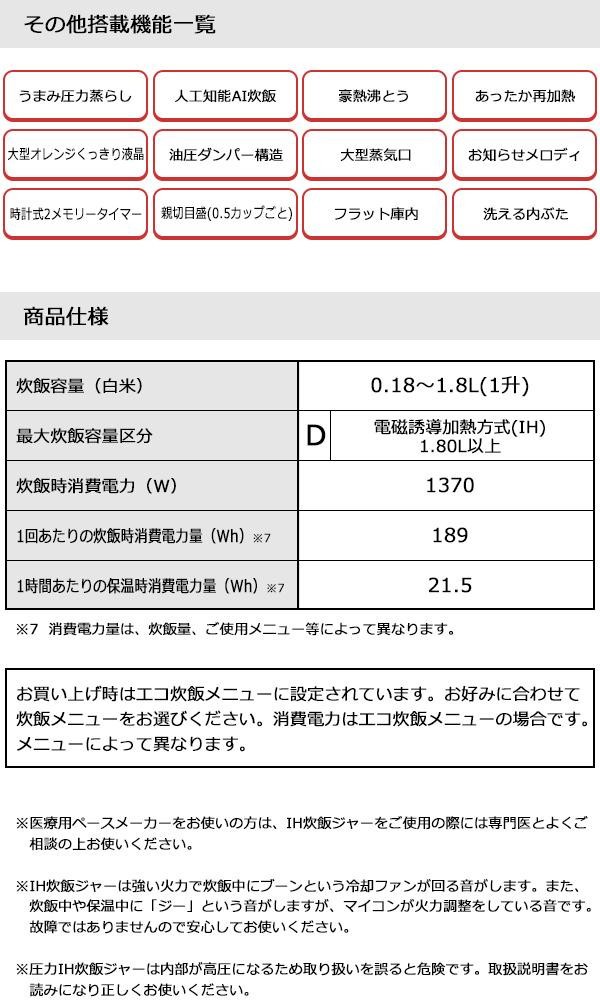 | 付属品 | しゃもじ、しゃもじ受け、計量カップ(白米用・無洗米専用)、取扱説明書兼保証書(保証期間:1年間※内釜フッ素加工:3年間) ※取扱説明書に「お料理ノート」ページあり |
