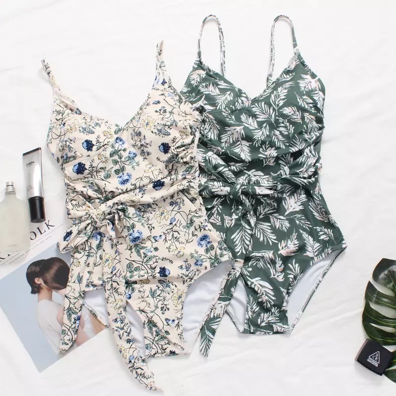 【関連キーワード】リーフ柄 ワンピース水着 体型カバー レディース Vネック ウエストマーク 大人可愛い