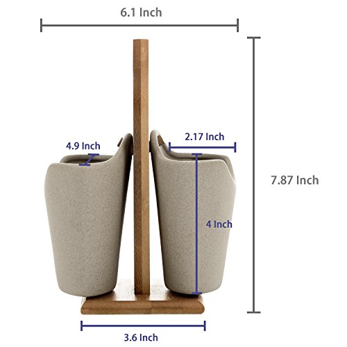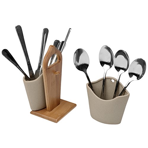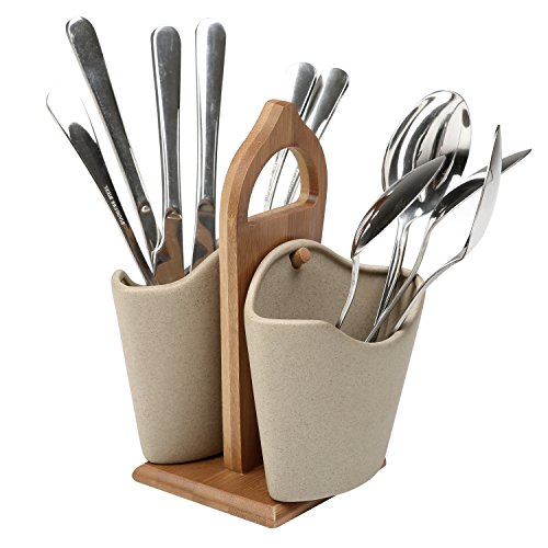 Portable Kitchen Utensil Caddy with 2 Gray Flatware Containers & Bamboo Carry Stand