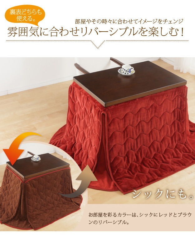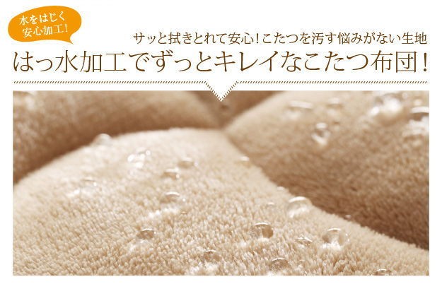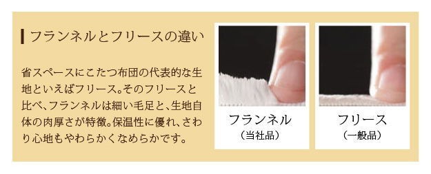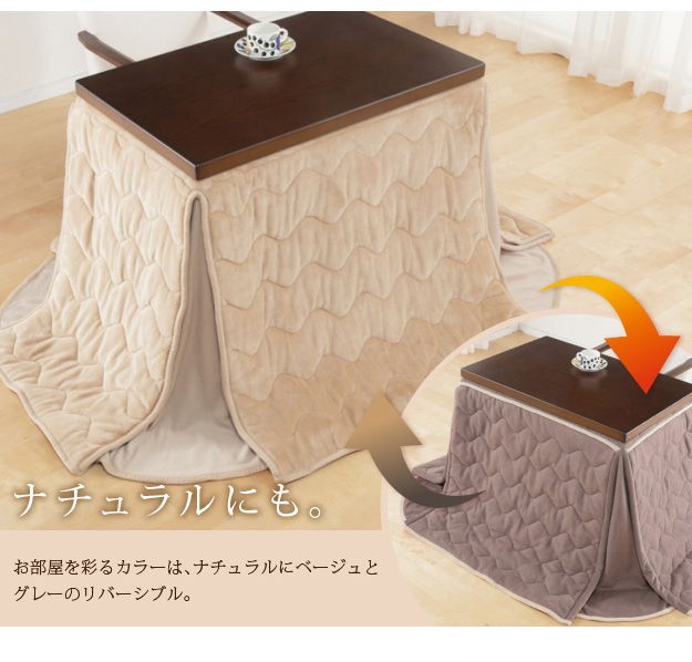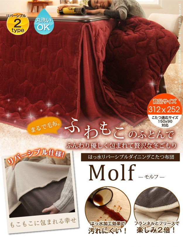 商品について:ダイニングこたつ(ハイタイプ)用のこたつ掛け布団。表面はふわふわ気持ちの良い肌触りのフランネル生地に汚れをはじく撥水加工を施しました。裏面は暖かなフリース素材。表裏両面使えるリバーシブル仕様です。洗濯機で丸洗いできるので、いつも清潔。お子さまやペットのいるご家庭にもおススメです。