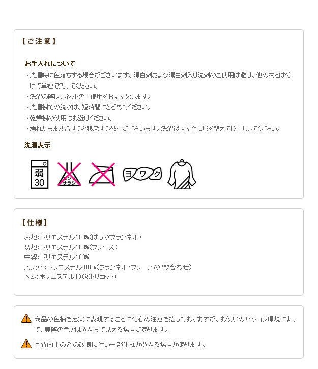 材質:表地-ポリエステル100%(撥水フランネル)、裏地-ポリエステル100%(フリース)、中綿-ポリエステル100%