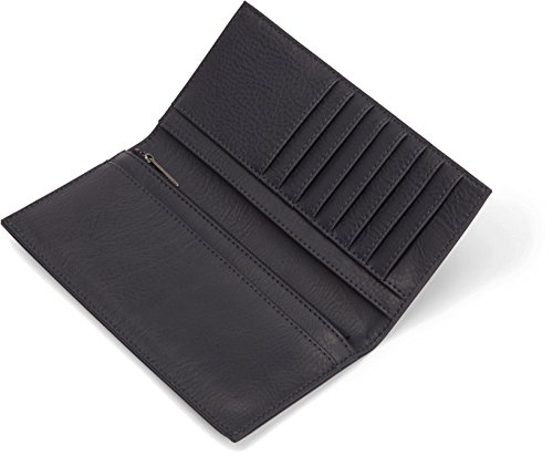 Slender bifold wallet with zipper coin pocket. INTERIOR: 8 card slots, 1 bill compartment, 2 slit pockets.