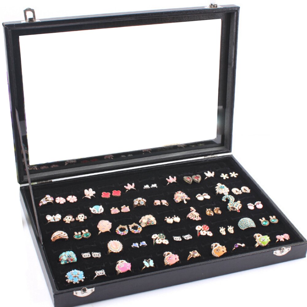 サイズ:長さ→35cm 幅→24cm 高さ→4.5cm 10列 最大100個収納可能!整理しやすいジュエリーケースです。 指輪だけでなく、ピアスやイヤリング、時計、ネックレスなど入れてもいいですね。バラバラと失くしやすいアクセサリーも、これ一つでスッキリ解決!! 材質:高級的な合成皮革(PUレザー)+ガラス+フランネル重量:約1.3kg。ベルベット調の素材で高級感もあり、ディスプレイとしても利用できます。ガラス窓から中が覗けるので、ご自慢のコレクションケースとして、お部屋に飾ってくださいね。 蓋とベースは丈夫で、設計も良くて、非常に実用的なジュエリーボックスです。結婚、誕生日、進学、パーティーなどに素敵なプレゼントとして最適です‼