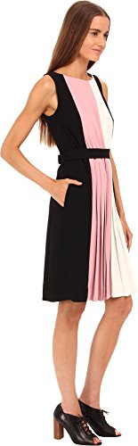 A-line silhouette. Bateau neckline. Sleeveless. Hidden back zip closure. Elastic waist band. Front panel pleats. Straight cut hem. 100% polyester. Machine wash cold, tumble dry low. Imported.