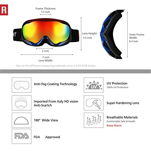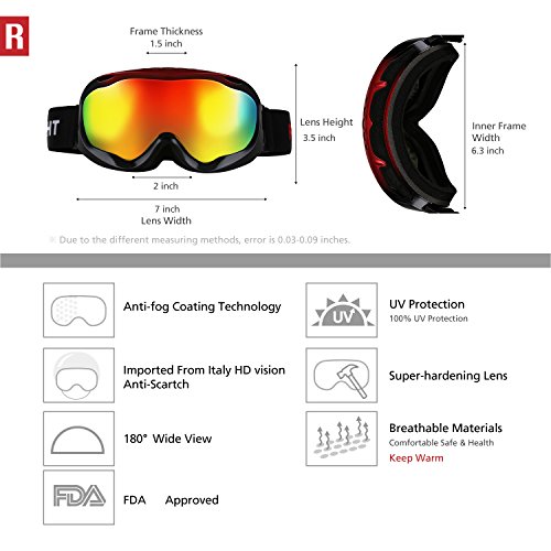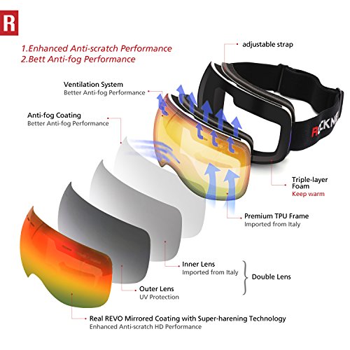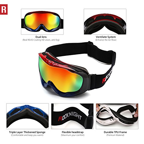 -. Brand : Rocknight -. Feature : Bendable High-quality PC Lens and Flexible TPU Frame secure more safety / Dual-layer anti-fogging, anti-glare Protection coating with super cool REVO reflective lens. These provides excellent optical clarity as well as 100% UV400 protection. / Smooth air-flow system brings fresh air and exhaust moisture quickly and effectively. It reduce fogging and optimizes the flowing air over the inside of the lens. / Triple-layer high density and soft form attached tightly on frame to keep your warm on the mountain and cut winds out. / The extra long adjustable elastic strap for any helmet compatibility. It makes these the perfect goggles suitable for both men, women & youth. -. Label : Rocknight -. Manufacturer : Rocknight -. ProductGroup : Sports -. ProductTypeName : OUTDOOR_RECREATION_PRODUCT -. Publisher : Rocknight -. Studio : Rocknight -. Title : Rocknight Ski Snow Goggles - Dual Lenses Snowboard Goggles for Men, Women & Youth with UV400 Protection Anti-fogging