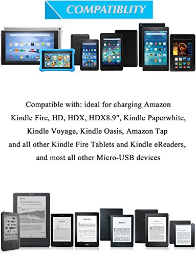 1*10ft Flat Noodle cable compatible with: ideal for charging Amazon Kindle Fire, HD, HDX, HDX8.9", Kindle Paperwhite, Kindle Voyage, Kindle Oasis, Amazon Tap and all other Kindle Fire Tablets and Kindle eReaders, and Android Cell Phones, Computers, Tablets, MP3 players, Cameras, E-readers, External batteries, and all other Micro-USB devices, like Samsung LG HTC Moto ZTE Nexus Blackberry Nokia Sony HP Dell Canon Nikon and many more.