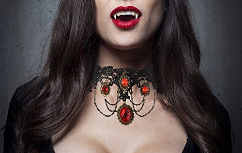 Material - The vampire fangs are made of plastic,the vampire chokers are made of black lace and Ruby.