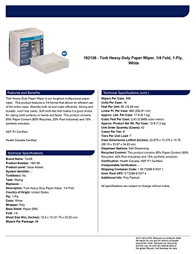 -. Title : Tork 192136 Heavy-Duty Paper Wiper, 1/4 Fold, 1-Ply, 12.5" Width x 13" Length, White (Case of 16 Packs, 56 per Pack, 896 Towels)