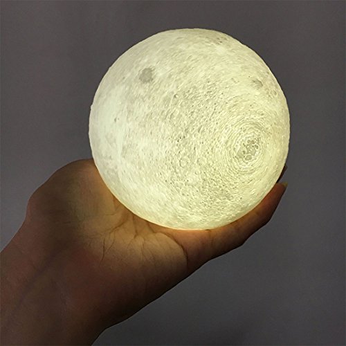 -. Feature : Made of environmentally friendly biodegradable materials PLA. Odorless and harmful. / 3D printing technology, replicating the actual Moon's surface, very nice looking at close or distance. / Sensitive touch switch, stepless dimmable, 2 color modes, easy touch to change the colors to yellow or white. Rechargeable and save energy. / Great decoration for your home, bedroom, desk and bookshelf. Amazing gift for kids, friends, graduation, birthday, festival, Halloween, Thanksgiving, Christmas. / Package include: 1 x moon light 1x USB cable 1x wooden mount