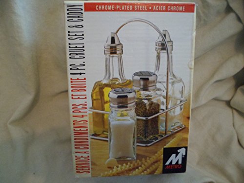 -. Brand : METRO -. Color : chrome -. EAN : 0795508775955 -. Feature : 4 pc. cruet set / Includes oil and vinegar cruets plus salt and pepper shakers / Sleek, single styling looks at home in classic or contemporary surroundings / Heavy gauge chrome plated steel last longer than wood and plastic and will not rust / Takes up minimal space on table or counter -. Label : China -. Manufacturer : China -. ProductGroup : Kitchen -. ProductTypeName : KITCHEN -. Publisher : China -. Studio : China -. Title : 4 pc. Cruet Set & Caddy Salt. Pepper, Oil and Vinegar -. UPC : 795508775955