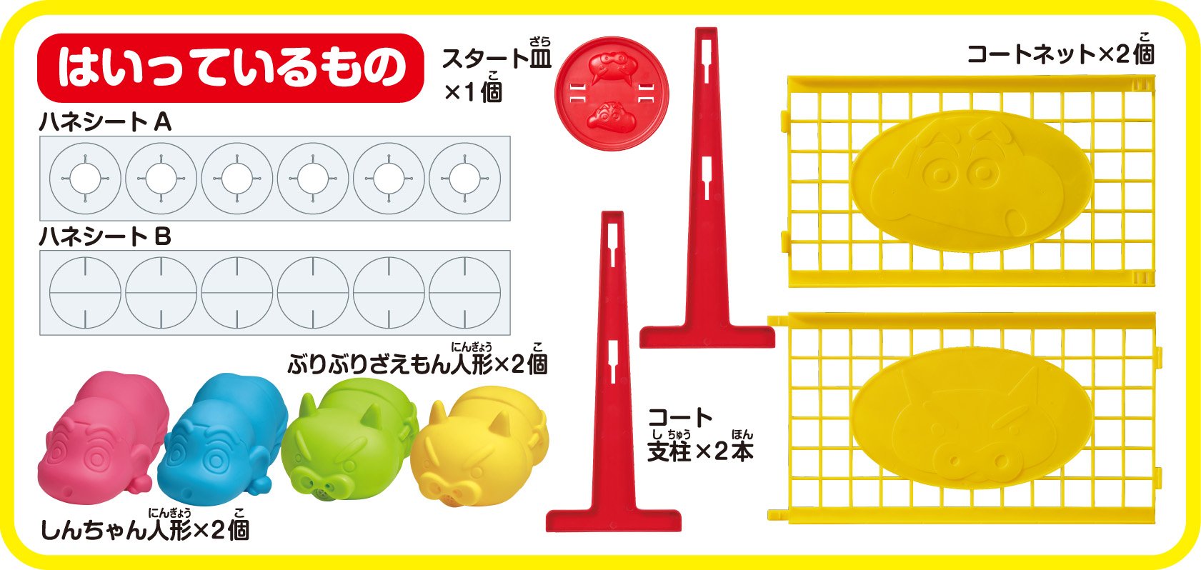 Shin chan 2 puppets, 2 swinging doggy dolls, 2 court nets, 2 coat pillars, start dish, honey sheet A, honey sheet B