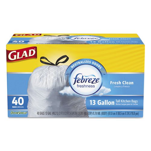 -. Feature : OdorShield® technology and Febreze® freshness. / Neutralizes odors and leaves behind a fresh, clean scent. / Reinforcing bands add strength while reducing plastic. / Strong, 3-layer drawstring closure for easy lifting, carrying and tossing away. / Great for offices, day care centers, schools and restaurants.