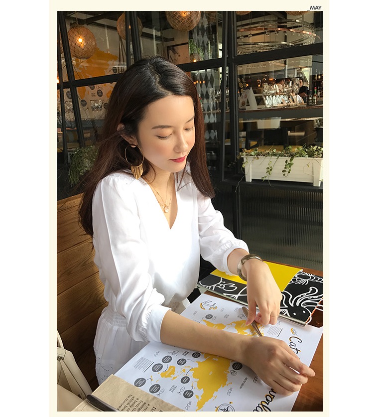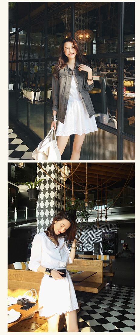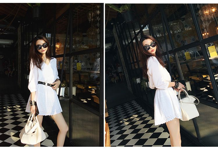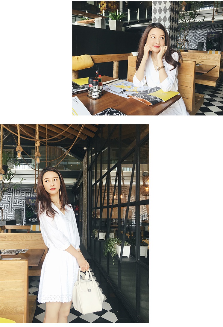 デコルテを美しく見せるVネックと、スカート部分のレースがフェミニンな一着。