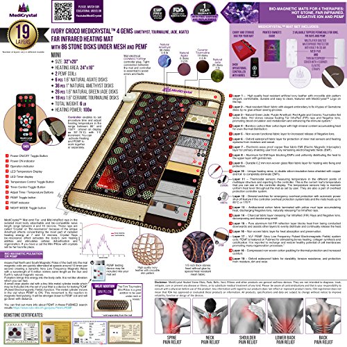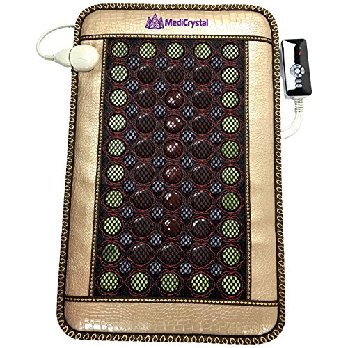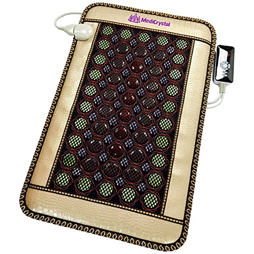MediCrystal infrared Mats come from the FDA registered, TUV, FCC and CE certified manufacturers. Top 10 reasons to choose MediCrystal Mat over competitors 1. You buy directly from the American company, trusted Amazon seller, and experienced Importer. Our family team specializes in online direct sales to maintain low operating expenses passed on as savings to our customers 2. You get the top specs product with new zero EMF heating system, High End eco-leather with croco pattern. 3. You have the widest choice from Mini to Queen Mats of 8 collections. 4. We use only 100% natural certified Amethyst, Agate, Jade and best Ceramic Tourmaline to make these mats. 5) 1,6 inch (40 mm) Green Jade, Tourmaline and Agate and 1 inch very rare Amethyst flat disk stones are fixed by mesh fabric without glue. 6. MediCrystal Mat outperforms the previous generations of FIR mats. Our 4 Gems Mats are featured with 10Hz Bio Magnetic Pulsation (PEMF) function. 7. Our Mats are protected by the full One Year Warranty. 8. Each Mat comes with two FREE Multilayer waterproof protectors. 3-D Pad is great for body support evenly distributing pressure from the mat's hot stone disks easing sleeping and long sessions. Washable Cover is used on top for protection from sweat and spills. 9. Your health benefits and 100% customer satisfaction are our top priorities. Your purchase from us is completely Risk Free. We guarantee you will love your mat and the results after just a few 1 hour sessions or we will refund your purchase price. 10. You have direct email access to our CEO Level Customer Support which resolves issues in fast and effective way within several hours 7 days a week. Holiday Promotion - Add Tourmaline Mini Pillow into the basket together with the mat and get it free. No matter how old you are - Revive yourself, your spirit and health. 0 |