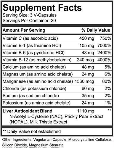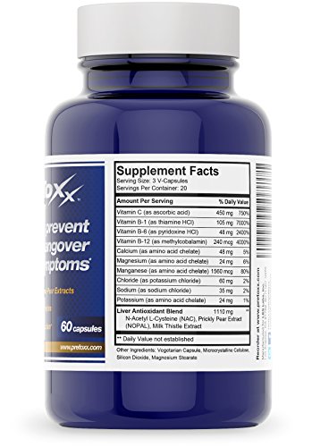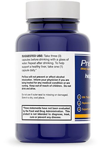 -. Binding : Health and Beauty -. Brand : LES Labs -. EAN : 0609728900731 -. Feature : HELPS PREVENT HANGOVER SYMP. PreToxx is specifically formulated to help prevent hangover symp and support healthy liver function without caffeine or pain relievers that put excess stress on your liver. / NATURAL INGREDIENTS IN VEGETARIAN CAPSULES. Packed with natural ingredients including prickly pear and milk thistle extracts to help fight nausea, dry mouth, and loss of appetite. / ELECTROLYTE BLEND REPLENISHES VITAL NUTRIENTS. Refuel electrolytes lost during alcohol consumption with a powerful blend of calcium, magnesium, sodium, chloride, and potassium. / DRUG-FREE FORMULA SUPPORTS THE BODY'S ABILITY TO PROCESS ALCOHOL. N-Acetyl L-Cysteine helps the body metabolize alcohol by boosting your body's supply of glutathione. / HELPS SUPPORT A HEALTHY LIVER WHEN TAKEN DAILY. PreToxx isn't just for drinkers. Take 1 PreToxx capsule daily to help support healthy liver function. Our supplements are manufactured in the USA with the highest-quality ingredients from around the world. -. IsAdultProduct : 0 -. Label : LES Labs -. Manufacturer : LES Labs -. Model : 0 -. MPN : 2826666031 -. PackageQuantity : 45 -. PartNumber : 2826666031 -. ProductGroup : Health and Beauty -. ProductTypeName : HEALTH_PERSONAL_CARE -. Publisher : LES Labs -. Studio : LES Labs -. Title : PreToxx for Hangovers & Liver Support (60 Vegetarian Capsules) • With Prickly Pear, Milk Thistle, Cysteine & Electrolyte Blend • 100% Money-Back Guarantee -. UPC : 609728900731