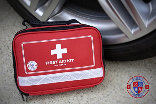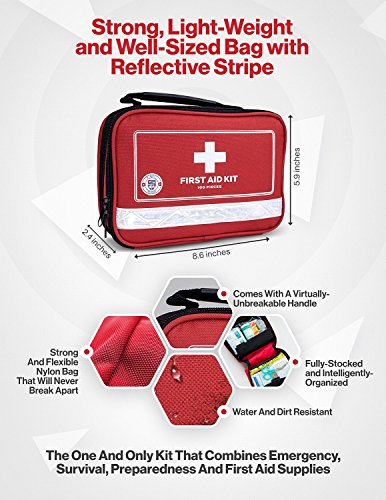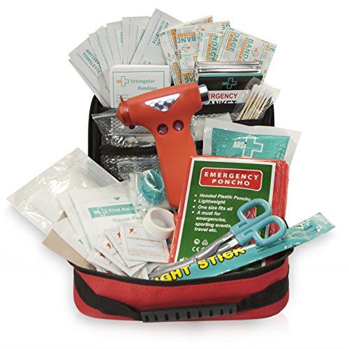 Be Always Prepared for Just About Everything in a Minor Emergency... From Giving CPR to Having a Tear in Your Pants! This first-aid kit is kind of one of those 'hope-you-never-have-to-use-it' things, but if you do, we've got you covered! Comes in a water-resistant (not water-proof) soft bag, is designed to last a long time, no matter how rough you play indoors or outdoors. Refill it with your own trauma supplies if something runs out. Forget about bulky and heavy first aid boxes. Being so small and light-weight, it's perfect to stash in any vehicle, backpack or diaper bag for the kids. It's full of preparedness, tactical and first aid kit items (100 of them)... Comes with special items, such as: compass, poncho, Mylar blanket, CPR mask, whistle, sewing kit... among others (For detailed contents please refer to the pictures on top of the page). Keep one in your home, and one in each of your cars just in case. The classic red design and white cross make it easy to spot. You can also take this camping, hiking, bike riding, to work, to school. Send one to college with your son or daughter for the dorms!Feature