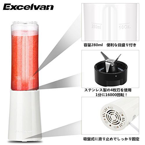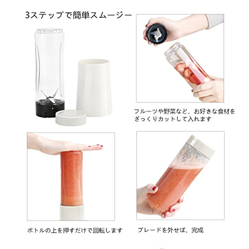 ボトルの上を押すだけで使える簡単な設計!3ステップで簡単スムージー! 1.フルーツや野菜など、お好きな食材をざっくりカットして入れます。 2.本体にセットして、ボトルの上を押すだけで回転します。 3.ブレードを外せば、完成です。そのまま飲むことができます。 お手入れ簡単な分解型パーツで、衛生的 容器と刃が一体になったブレンダーは、洗いにくく、ブレンダー部分に食材がつまりがち。 こちらのブレンダーは、容器とブレードが分離しており、とにかく洗いやすいのがポインタです。 シンプル構造なのでパーツが小なく、後片付けも楽ちんです。 | 【製品仕様】 サイズ:59*76*256mm 重量:約540g ボトル容量:280ml 本体素材:ABS ブレード素材:ステンレススチール 電源:AC 100V, 60Hz 消費電力:150W 回転数:16000回転/分 付属品:キャップ、日本語取扱説明書 【注意事項】 1.水が入っていない状態で本製品を運転させないでください。 2.本製品はロックアイス若しくは硬いナッツの粉砕に対応しません。冷凍された果物・野菜などは半解凍してからご使用ください。 3.運転するとき、ボトル全体を真上から押してください。 4.長時間の連続運転はしないでください。(連続して運転する時間は1分以内とし、繰り返し使用する場合は1分以上休ませてからご使用ください) | このブレンダ―は、水やスープなどの液体と一緒にジュースやピューレ状にするような、かくはん作業に適していますが、フードプロセッサー・フードカッター・ドライミルの機能はありません。そのため、下記に記載するような食材には使用出来ません。故障・損傷の原因になりますのでおやめ下さい。 【使用禁止食材】 ≪ロックアイス≫ アイスクラッシャーではありませんので、ロックアイスの粉砕はできません。(角氷は粉砕出来ますが、氷の破片が残る場合がございます。角氷は約2cm以下のものを使用してください) ≪完全に冷凍された果物・野菜≫ 冷凍された食材は、半解凍してからご使用下さい。 ≪肉・魚類≫ 挽肉作りなどにはご使用できません。 ≪泡立てや生地作り≫ 卵白の泡立て、生クリームのホイップ、パン、ケーキ、パイ生地作りなどにはご使用できません。 |