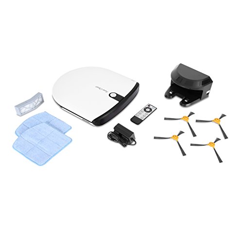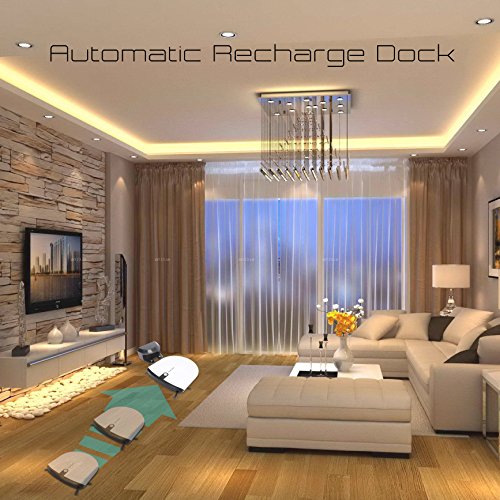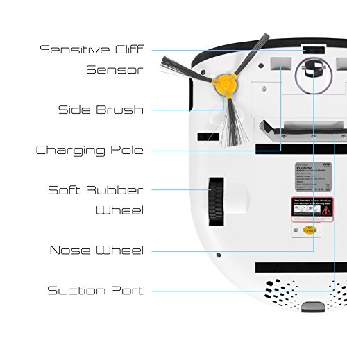 -. Feature : ULTRA LOW PROFILE: Only 2.4" height helps this thin robo vac automatically reach places in your house that other units can't. Fits under any bed, couch or table. No compromise to effectiveness with 350ml dustbin capacity. / AUTOMATIC RECHARGE DOCK: This quiet robot vacuum seeks the charging dock after it is finished sweeping. Built-in lithium 2200mAh rechargeable battery allows for 2 hours of wireless cleaning before self returning to the electric charger. / SMART ROBOTIC CLIFF SENSOR: Smart auto vacuum sweeper has built-in IR sensor preventing it from running off stair ledges and from directly running into obstacles. Great for cleaning tile, hard carpet and hardwood floor in any home, room or kitchen. / ALLERGY AND PET FRIENDLY: Small bot has Powerful 24w suction and dual rotating sweepers that eliminate the need for rotating underbrush - no clogging or malfunction caused by cat or dog hair! Hepa filter keeps dust trapped, air pure and is great for allergies. / DUAL ROTATING BRUSHES: the white robotic floor cleaner makes life easy with 2 side sweeper brushes extend the reach of the vacumn and rotate to catch dirt and sweep debris on open floor or along walls or edges. 1 Year manufacturer's warranty.