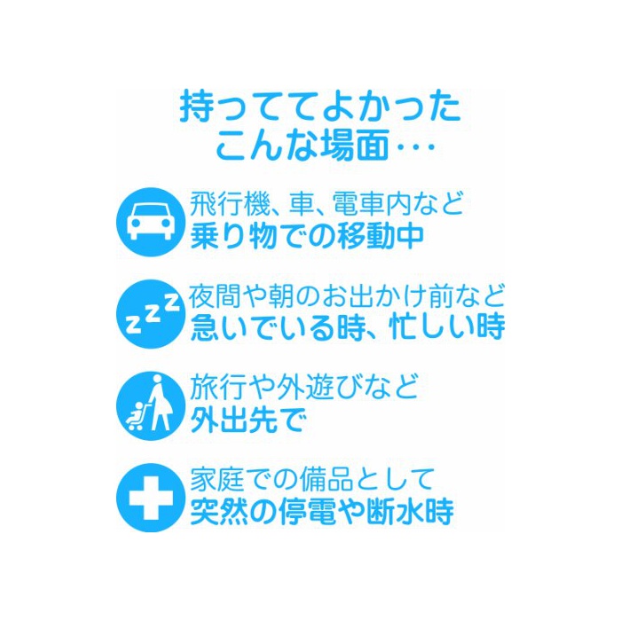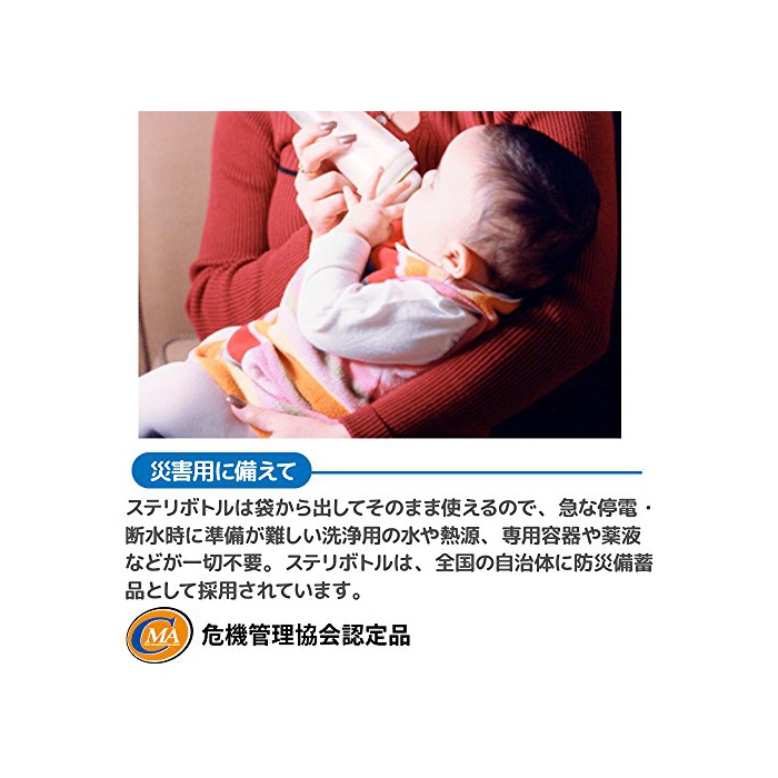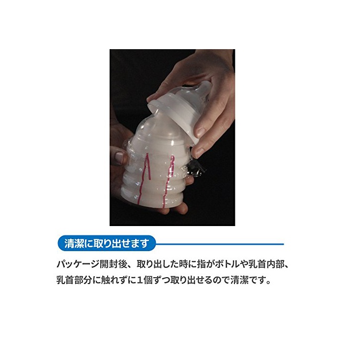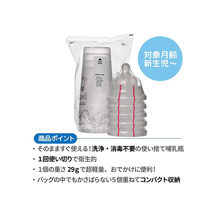 세정 소독 불요! ! 생산 공정으로 200℃이상의 고온 환경하의 공정 뒤,완전히 관리 된 클린 룸에 팩키지☆ 보존 봉투에 동봉하고, 개봉해서취 낼 때,손가락이 보틀 내부나 nipple 부분으로 닿지 않아 청결♪ 1회 한 번 쓰고 버리고 매회 새로운 젖병을 사용 하기 위하여,세정 소독 불요.재해 긴급 시에서도 안심 수유에 옵니다.수도 시설이나 소독기기가 없는 재해 긴급 시에서도 인출고 곧바로 사용하실 수 있습니다.