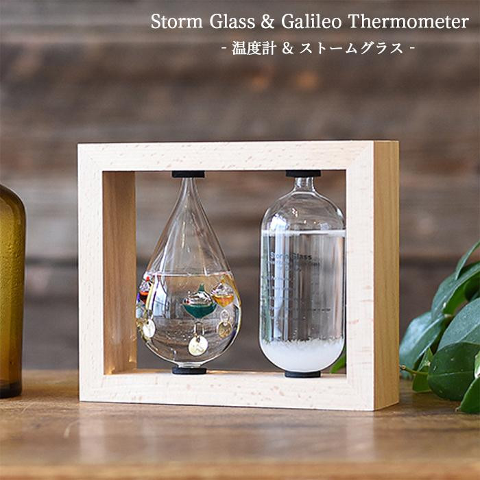 液体の比重が温度によって変化する原理を使って作られた温度計と、天候によって結晶の様子が変化すると言われているストームグラスのセットです。インテリアとして、置くだけでも目を楽しませてくれます。 |