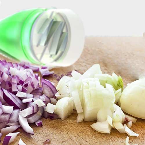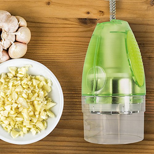 SEE WHAT YOU’RE DOING - Features a high-quality plastic housing in fashion-forward green. The clear blade cover protects you from the chopping mechanism and lets you see exactly what you’re preparing. Resilient stainless steel blades rotate in one easy push motion to effortlessly chop and slice garlic, onions, and more like a pro. Simply unscrew the plastic case and rinse for easy clean-up.
