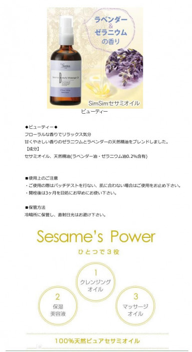 SimSimセサミオイルは、圧搾機を使い、ゴマを押しつぶして油を搾り出した後、和 紙や布などでろ過を繰り返す圧搾法で抽出。専用の窯を使い、キュアリング(加熱処理)を行っています。ベタつかず、サラッとした使い心地なので、クレンジ ングオイル・美容液・保湿液・マッサージオイルなどとしてお使いいただけます♪