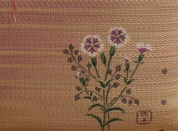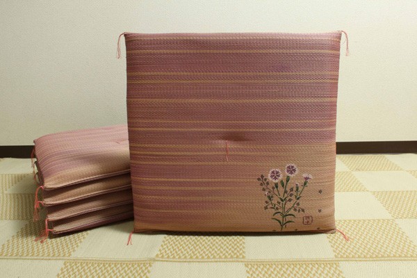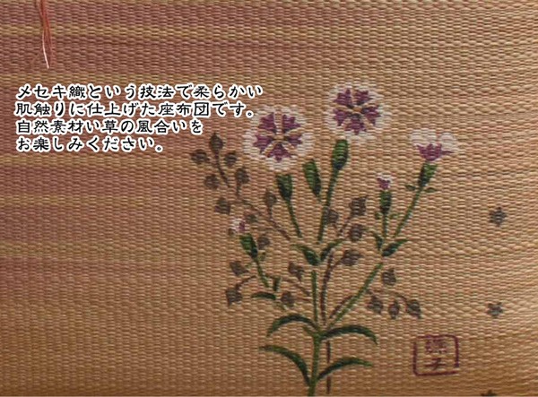 職人が1枚1枚手作業で捺染プリントを施したイ草座布団です。メセキ織という技法で柔らかい肌感触に仕上げました。またイ草の生地を縫製した後に、生地を湿らせ、裏返しにする『返し』という技法で仕上げております。イ草を通常曲げてはいけない方向に曲げますので、良い(太く強い)イ草でなければ作ることができません。返すことにより、ふっくらしたボリューム感を出しました。国産(九州産)のい草を使用しています。一本一本が太く、表皮が厚く繊維がキメ細かいので弾力性があり、耐久性に優れています。い草には空気の自然浄化作用、湿度の調節作用などがあります。また汚れにくく、使用するうちに黄金色に変化し味が出ます。い草に青森ヒバ加工を施しています(抗菌、防臭効果)。中材はウレタンをフェルトでサンドした三層構造で、適度なクッション性があります。※柄のプリントは職人が手作業で描く為、同じ色・柄であっても多少風合いが異なります。
