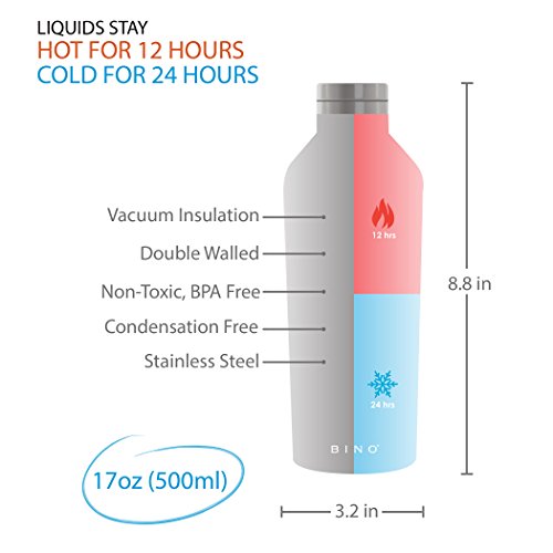 Studio : BINO Publisher : BINO Binding : Misc. Product Description BINO's 17 ounce Double Walled Vacuum Insulated Stainless Steel Water Bottle keeps liquids cold for 24 hours and hot for 12 hours! Our Water Bottle is 100% BPA-Free and made from all non-toxic materials. Our Water Bottle will fit in most cup holders and is condensation free. It features a conveniant spill-proof screw top lid that makes taking drinks on the go easy! 0