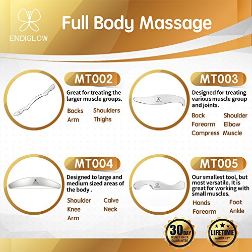 Are you looking for a better full body massage kit? Then you need ENDIGLOW Graston Tools! When sore muscles, aches and pains, and old injuries keep you from living a full, active lifestyle, you need a set of massage tools that help you feel better all over. That's why we created the ENDIGLOW Soft Tissue Massage Tools designed to roll away deeply-rooted knots and treat fascia dysfunction. FULL BODY MASSAGERS : MT002: The size and desired weight are great for treating the larger muscle groups. such as:Backs, arm, shoulders, thighs. MT003:This tools shape in particular has the most variety of application. It is designed for use on smaller to medium sized areas of the body such as the back, forearms, neck, calves, and pectoral muscles. The pointed design can be used on smaller joints of the body. MT004:It has a double beveled edge running completely around the tool. It is great for working around the shoulders, knees, arms, and around small to medium muscles. MT005: It is the smallest tool we offer, but it is also the most versatile. It is great for working with small muscles, hands, forearms, feet, ankles or smaller joints. Click 'Add to Cart' above to start relieving soreness and pain so you can recovery faster, feel better and relax more deeply. 0 |
