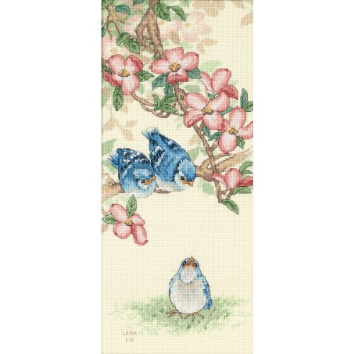 How did you guys get up there? our baby blue jay seems to ask. This playful trio is stitched with a blend of Cross and Half Cross Stitches to create wonderful shading. Kit contains cotton thread, 14-count ivory Aida, thread palette, needle, and easy instructions. Finished size: 7 by 16 inchesFeature