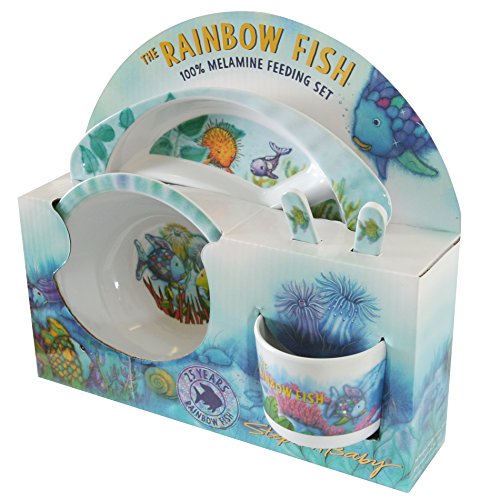 -. Feature : The Rainbow Fish 5-piece melamine dinnerware set includes a plate, bowl, cup, fork and spoon / Divided plate features an all-over underwater scene of the Rainbow Fish and his friends accented with shimmering silver / Bowl is nicely illustrated and has soft blues and purples at the rim; handled cup, fork and spoon are perfectly sized for small hands / Gift-boxed 5-piece melamine set is 100% BPA and phthalate free; HAND WASH ONLY / Since 1987, Stephan Baby has been creating unique and heartwarming gifts for little ones