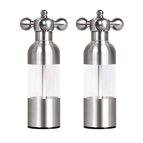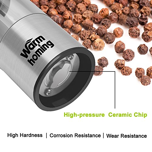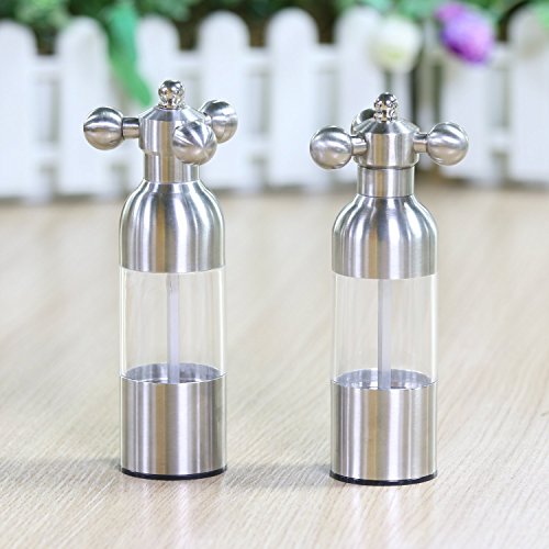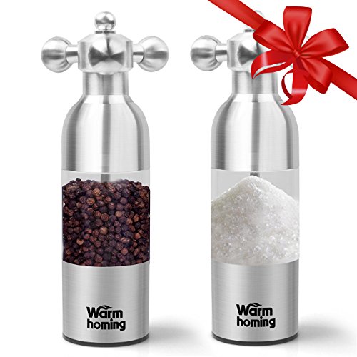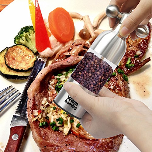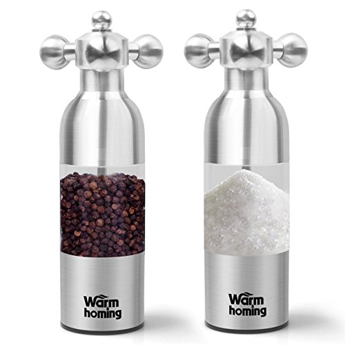 Warmhoming Salt and Pepper Grinder Set/ Pepper Grinder/ Salt Mill/ Stainless Steel Salt and Pepper Mills Set THE SECRET ON HOW TO MILL PERFECT SIZED PEPPER/SALT GRAIN EFFORTLESSLY LIKE CHEF MASTER - FAST, EASY and FUN! - Do you worry about synthetic pepper and salt mill maybe contain insecurity ingredient? - Or are you looking for one tool to mill fine pepper and salt grain effortlessly? Either way, this fantastic kitchen gadget is for you! Why this Pepper and Salt Mill is ideal for you? ?Great Design: Heavy duty, quality construction, large ergonomic handles provide leverage and makes whirling easy and efficient. Capable of holding large amounts of seasoning, allow you to do a lot more grinding and less refilling. ?Saves you money: Made of unbreakable, heavy duty stainless steel from head to toe, this pepper and salt mill is the last garlic press you ever need to buy! ?Saves you time: This tool will save precious minutes by allowing you to prepare dishes faster. Producing perfect sized pepper and salt grain in seconds. This pepper and salt mill is extremely simple to use. ?Easy to clean: Simply unscrew the top cover and hand wash the grinding mechanism and the stainless steel body with a mild soap. ?The end of bland cooking: Add fresh pepper grain to your meals everyday. ?Perfect Gifts: A solid, great tool for moms, professional chefs, cooks and healthy conscious people. If not completely satisfied, WE'LL GIVE YOU A FULL REFUND, NO QUESTIONS ASKED! 0 |