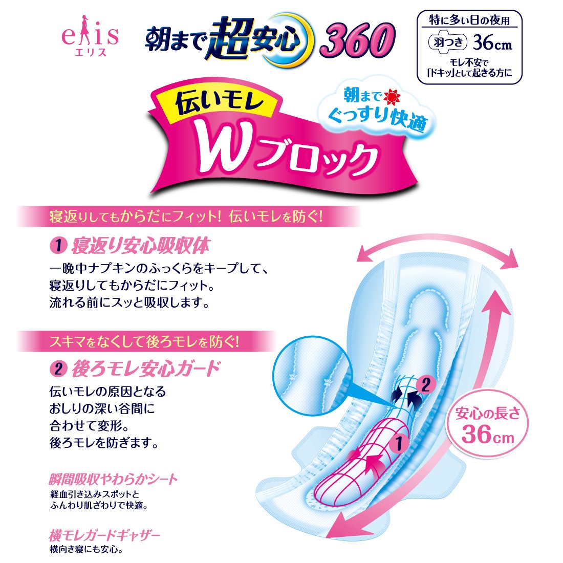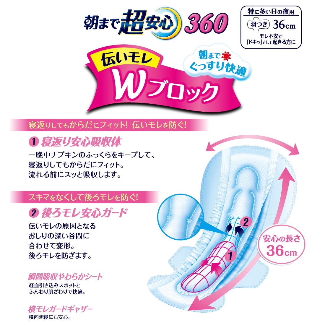 ● "Turn over safe absorbent body" keeps the napkin's plump all night and fits the body even if you turn over.