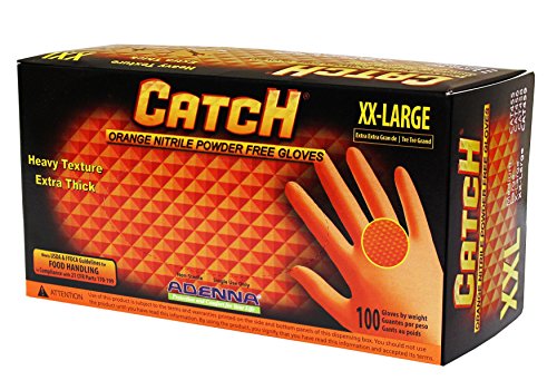 Studio : Adenna Inc. Publisher : Adenna Inc. Binding : Misc. Product Description Catch Orange nitrile powder free gloves possess a heavy textured surface that provides an impeccable grip. With an average 8 mil thick finger thickness, this glove offers extra protection and stronger resistance to wear and tear. The vibrant Orange color increases visibility at the work place and enhances safety. Catch nitrile gloves are favored by Aviation, mechanic, marine, plumbing and manufacturing industries because of their incredibly strong grip and vivid bright color. The extra thickness makes these gloves more durable when working on "Rougher" jobs while keeping hands safe and protected against harsh chemicals, solvents and paints. 0